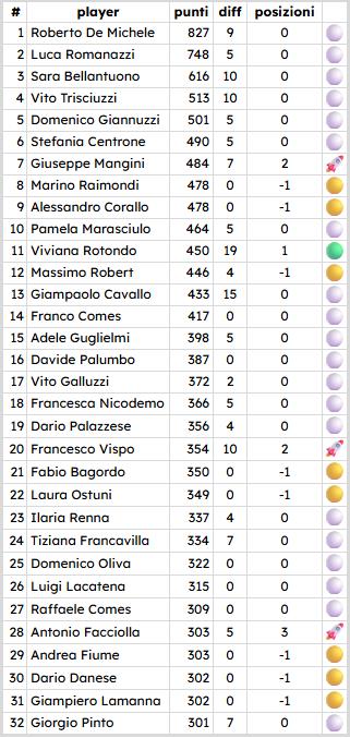 In fondo, ma non per importanza, notiamo la crescita di Ilaria Renna (23ª, +4) e Tiziana Francavilla (24ª, +7). Grandi mosse di Antonio Facciolla (28°, +5) che entra nel club dei 300 e, sorpresa! Giorgio Pinto (32°) guadagna 7 punti, raggiungendo quota 301 e tenendosi stretta la coda della classifica! Non mollare, Giorgio!