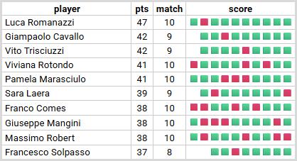 Luca Romanazzi si prende lo scettro con 47 punti in 10 match! Un vero rullo compressore. Non c’è dubbio, Luca è in grandissima forma e i suoi 47 punti sono un avvertimento per Roberto De Michele.