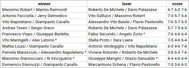 Da sottolineare la vittoria di Pamela Marasciulo / Alessandro Napoletano (3-6 6-3 7-6) proprio contro Viviana Rotondo / Roberto De Michele. Battere il numero 1 non è da tutti, specie se in tre set di pura lotta. Bravi!