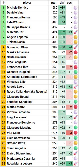 Appena fuori dalla Top 10, Sante Gialluisi perde un colpo scivolando all’undicesimo posto, mentre Pina Fanigliulo resiste dodicesima con 16 punti freschi. Francesca Pinto e Antoniana Legrottaglie perdono terreno, scivolando rispettivamente al 13° e 15° posto, strette nella morsa di un Gennaro Ruggieri in risalita (+1 pos. e 27 punti).