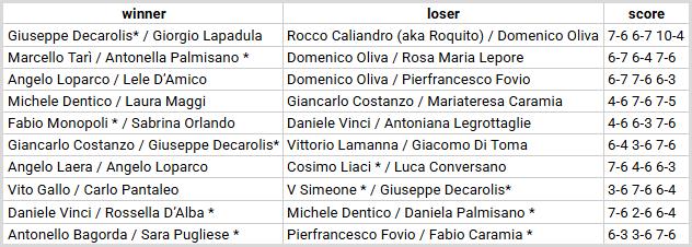 Non meno drammatico il successo di Marcello Tarì e Antonella Palmisano, che hanno piegato Domenico Oliva e Rosa Maria Lepore in una battaglia chiusa 7-6 al terzo set. E che dire del leader Michele Dentico? In coppia con Laura Maggi, ha dovuto faticare le proverbiali sette camicie per avere la meglio su Giancarlo Costanzo e Mariateresa Caramia (4-6 7-6 7-5). Quando il gioco si fa duro, i campioni del padel fasanese iniziano a giocare sul serio!