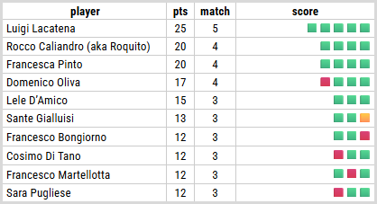 Alle sue spalle, con 20 punti, abbiamo il duo delle meraviglie: Francesca Pinto e Rocco Caliandro (aka Roquito). Entrambi hanno un record immacolato (4 su 4). Francesca Pinto gioca con una precisione chirurgica che farebbe invidia a un orologiaio svizzero, mentre Rocco Caliandro (aka Roquito) corre così tanto che sospetto abbia dei motorini elettrici nelle scarpe. Entrambi restano stabili, ma con un distacco di 5 punti dal leader, devono iniziare a spingere se non vogliono vedere Luigi Lacatena scappare via col trofeo.