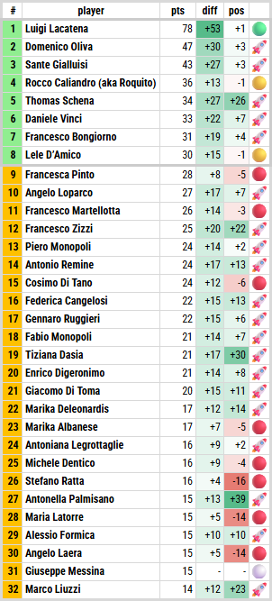 Chiudono la Top 10 Francesca Pinto, che subisce un tracollo di 5 posizioni (Francesca, serve più grinta!), e Angelo Loparco, che invece vola alto guadagnando 7 piazze e portandosi a 27 punti. Angelo, continua così e il podio non sarà più solo un miraggio.