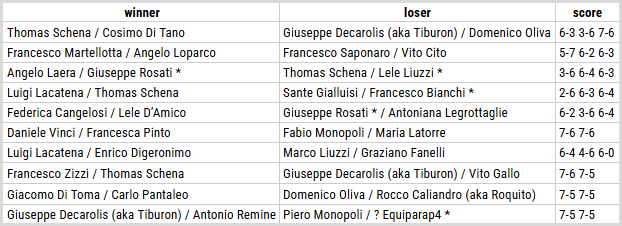L’ultima settimana è stata pura adrenalina. Il match tra Thomas Schena / Cosimo Di Tano contro Giuseppe Decarolis (aka Tiburon) / Domenico Oliva (6-3 3-6 7-6) è già leggenda. Un tie-break finale che ha fatto tremare i polsi a tutti.
