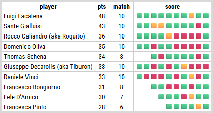 Al secondo posto troviamo Domenico Oliva, che guadagna 3 posizioni e 30 punti. Un balzo felino che lo porta a 47 punti totali. Domenico è solido, ma con quel distacco di 31 punti dalla vetta, più che un Oliva sembra un inseguitore che ha bisogno di un motore truccato per riprendere il leader. Terza piazza per Sante Gialluisi, anche lui in ascesa (+3 posizioni). Con 43 punti e solo una sconfitta, Sante sta dimostrando che la calma è la virtù dei forti (e di chi sa chiudere i punti a rete).