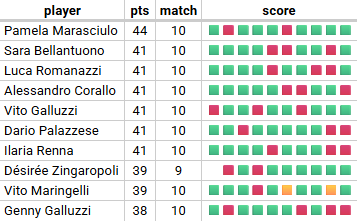 Se guardiamo solo all’ultimo mese, la regina è lei: Pamela Marasciulo con 44 punti in 10 match. Seguono a 41 punti un plotone di esecutori spietati: Sara Bellantuono, Luca Romanazzi, Alessandro Corallo, Vito Galluzzi, Dario Palazzese e Ilaria Renna.