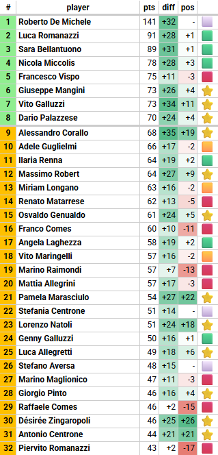 Partiamo dall’alto, dove l’aria è rarefatta e c’è solo lui: Roberto De Michele. Con 141 punti e 35 partite, Roberto sta portando il concetto di “presenzialismo” a livelli mai visti. Ha guadagnato altri 32 punti, confermando che il suo rapporto con il campo è più solido di un matrimonio felice. Roberto, ma a casa lo sanno che il centro sportivo non è un ufficio postale?